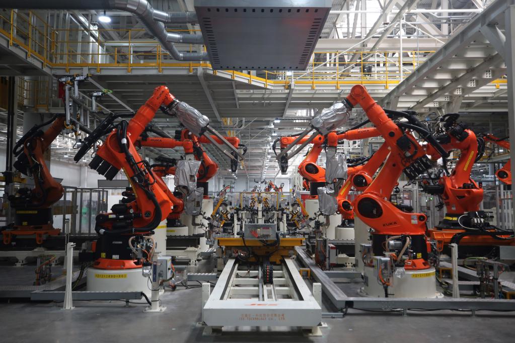 5月29日在合肥拍攝的大眾安徽模塊化電驅(qū)動(dòng)平臺(tái)工廠車(chē)身車(chē)間一角。新華社記者杜瀟逸 攝