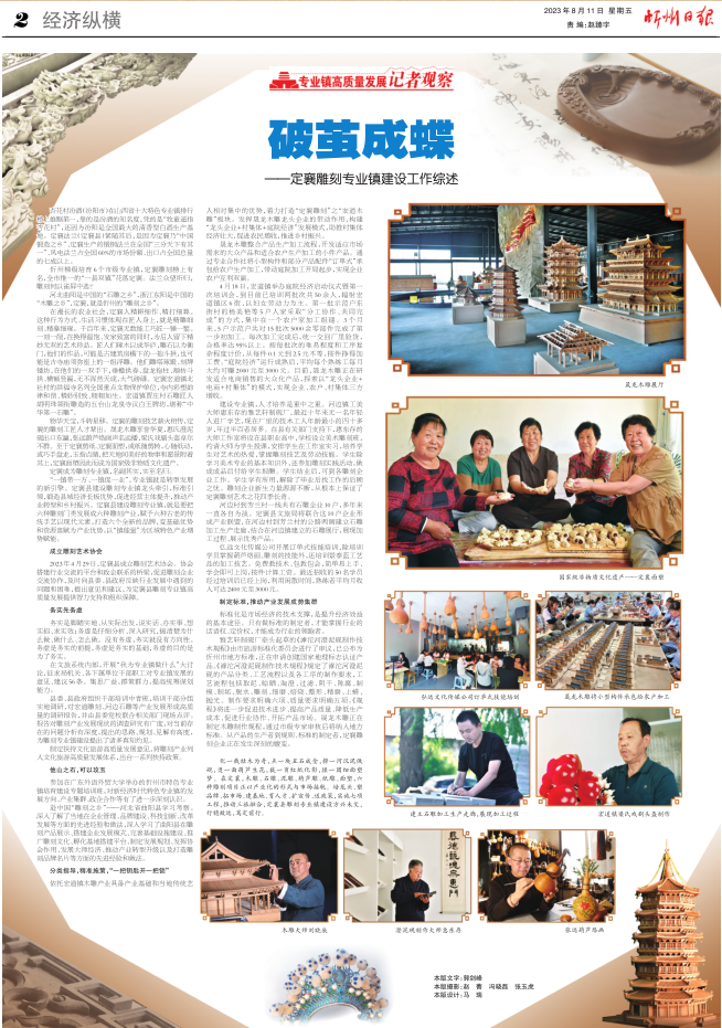 “一鎮(zhèn)帶一方、一鎮(zhèn)促一業(yè)”,專業(yè)鎮(zhèn)就是轉(zhuǎn)型發(fā)展的新引擎。定襄縣建設(shè)雕刻專業(yè)鎮(zhèn)龍頭牽引,標準引領(lǐng),鍛造縣域經(jīng)濟長板優(yōu)勢,促進經(jīng)營主體提升,推動產(chǎn)業(yè)轉(zhuǎn)型和鄉(xiāng)村振興。定襄縣建設(shè)雕刻專業(yè)鎮(zhèn),就是要把六種雕刻門類發(fā)展成六種雕刻產(chǎn)業(yè),賦予六種古老的傳統(tǒng)手藝以現(xiàn)代元素,打造六個全新的品牌,變基礎(chǔ)優(yōu)勢和資源稟賦為產(chǎn)業(yè)優(yōu)勢,以“鎮(zhèn)能量”為區(qū)域特色產(chǎn)業(yè)增勢賦能。