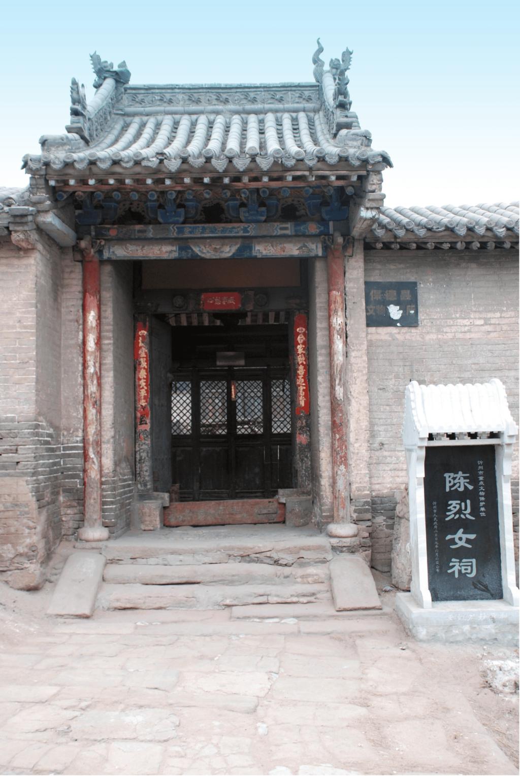 陳烈女祠坐西向東,為二進院落布局。占地面積685平方米。大門一座,前院過殿面寬三間,單檐硬山頂;南北配殿各面寬三間,單檐硬山頂。后院正殿面寬三間,單檐硬山頂,前設(shè)小抱廈;后院正殿內(nèi)供奉陳烈女塑像。祠內(nèi)存有明崇禎七年(1634)“圣旨(復(fù)制品)”一道,新繪壁畫16平方米。2007年6月,陳烈女祠被忻州市人民政府公布為市級文物保護單位。