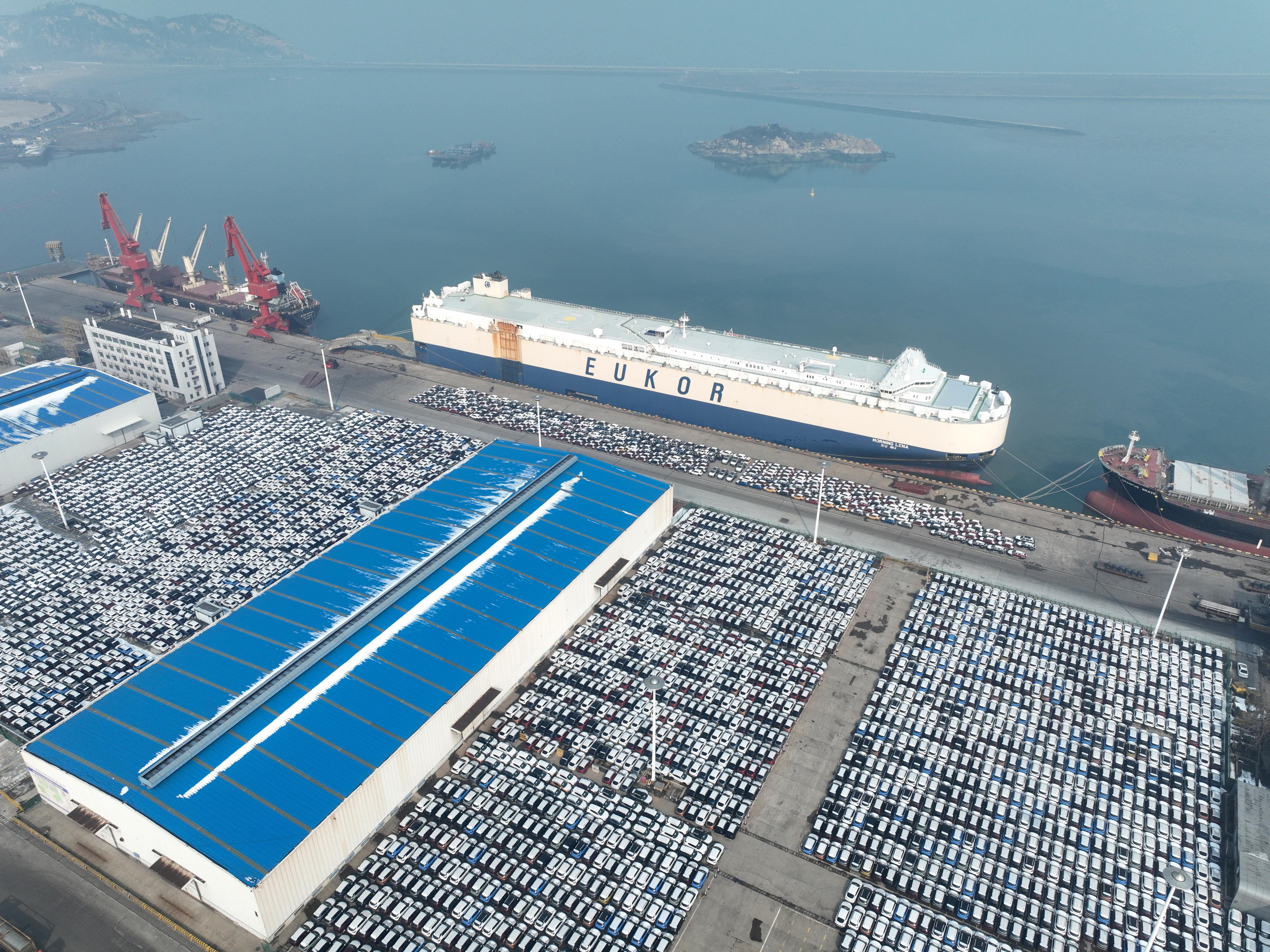 △在江蘇連云港港東方港務(wù)分公司碼頭,貨輪靠泊準(zhǔn)備裝載汽車出口海外。