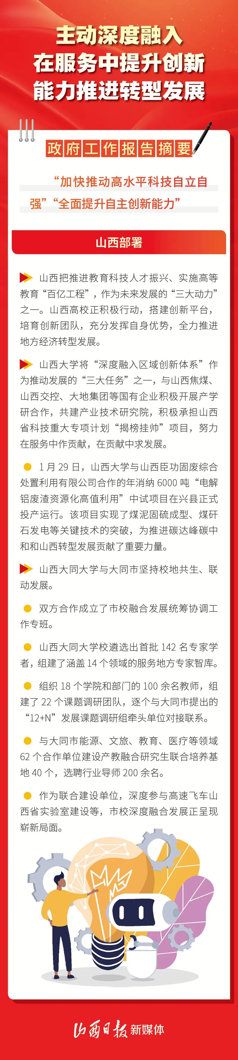 今年政府工作報告指出,堅持教育強(qiáng)國、科技強(qiáng)國、人才強(qiáng)國建設(shè)一體統(tǒng)籌推進(jìn),創(chuàng)新鏈產(chǎn)業(yè)鏈資金鏈人才鏈一體部署實(shí)施。這為山西高校更好地服務(wù)全省各地轉(zhuǎn)型發(fā)展、高質(zhì)量發(fā)展提供了遵循。