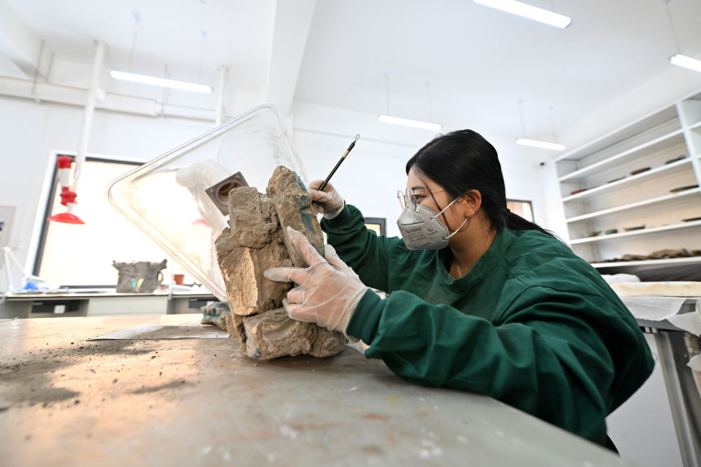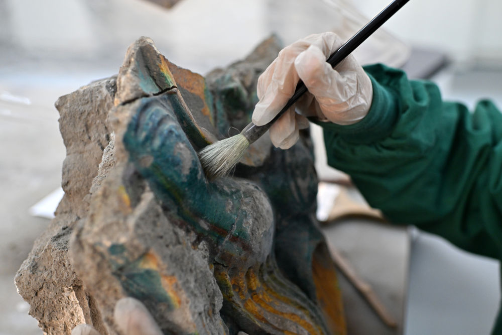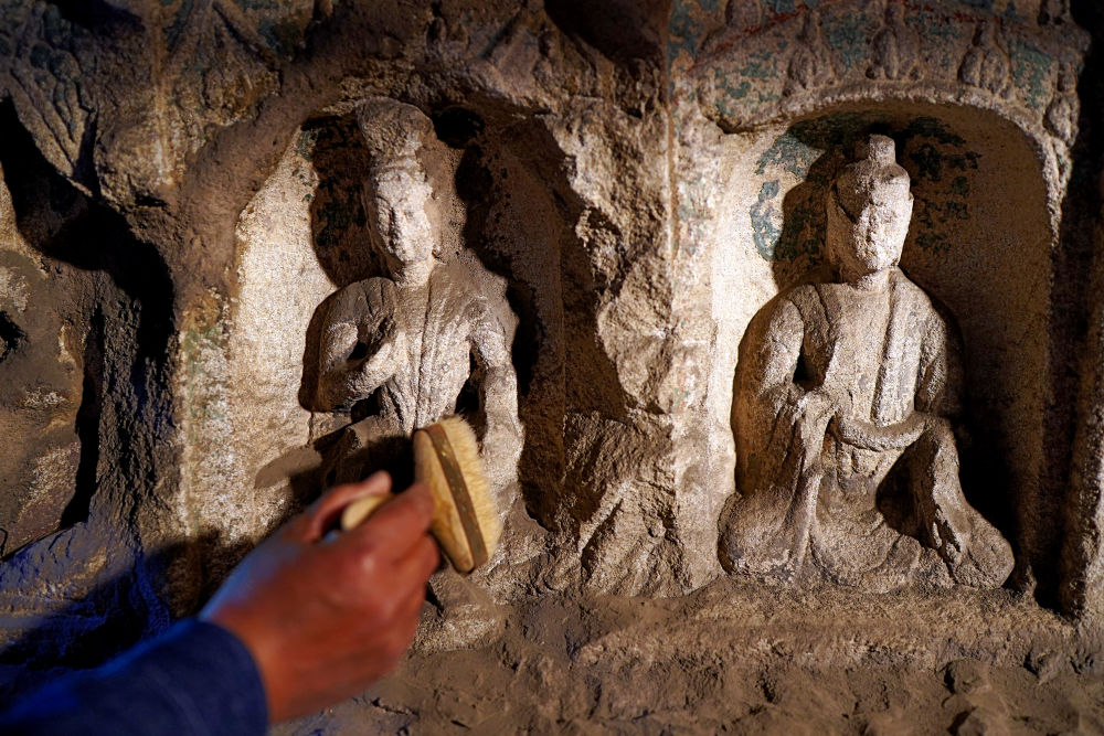 在云岡研究院可移動文物修復(fù)室,工作人員韓躍華在進行除塵作業(yè)(2024年2月26日攝)。