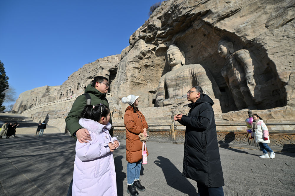 在山西大同云岡石窟,云岡研究院院長杭侃(右)在給游客講解石窟的歷史知識(2024年2月25日攝)。
