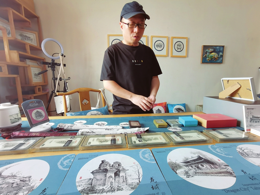 蕭剛與他的文創(chuàng)作品。