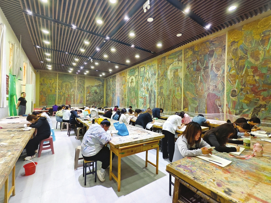 學(xué)生在永樂(lè)宮壁畫臨摹室臨摹壁畫。周明飛攝