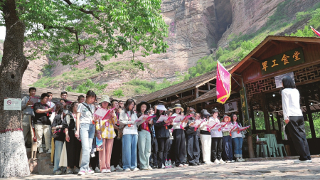 前來黃崖洞開展清廉教育的團(tuán)隊正在進(jìn)行清廉歌曲合唱。