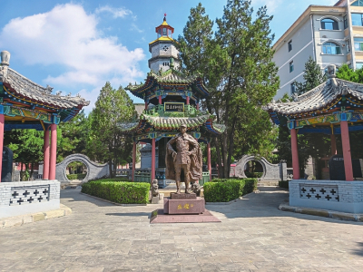 穿過大門,一座約3米高的古銅色左權(quán)將軍塑像巍然屹立。將軍身披軍大衣,目光堅(jiān)定地望向遠(yuǎn)方,仿佛仍在守護(hù)這片曾經(jīng)戰(zhàn)斗過的土地。塑像后方,蒼松翠柏掩映著亭臺(tái)廊廡,肅穆之感油然而生。