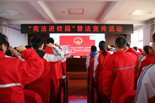 “我宣誓:忠于中華人民共和國(guó)憲法,維護(hù)憲法權(quán)威,履行法定職責(zé),忠于祖國(guó)、忠于人民……”授課結(jié)束后,全場(chǎng)人員緊握右拳,莊嚴(yán)宣誓,字字千鈞、擲地有聲的鏗鏘誓言在會(huì)場(chǎng)久久回蕩,充分表達(dá)了大家對(duì)憲法的信仰、尊崇與敬畏。隨后,法院干警向?qū)W生們發(fā)放了中院精心制作的憲法、平安建設(shè)、防范校園欺凌、未成年人保護(hù)、預(yù)防未成年人犯罪等法律知識(shí)宣傳手冊(cè)。