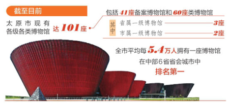 太原市充分發(fā)揮文物資源優(yōu)勢(shì),將博物館作為文物保護(hù)利用改革的突破口,傾力建設(shè)凸顯地方文化特色的“博物館之城”。截至目前,太原市現(xiàn)有各級(jí)各類博物館達(dá)101座,包括41座備案博物館和60座類博物館,其中省屬一級(jí)博物館3座、市屬一級(jí)博物館2座。全市平均每5.4萬(wàn)人擁有一座博物館,在中部6省省會(huì)城市中排名第一,遠(yuǎn)超全國(guó)平均水平。