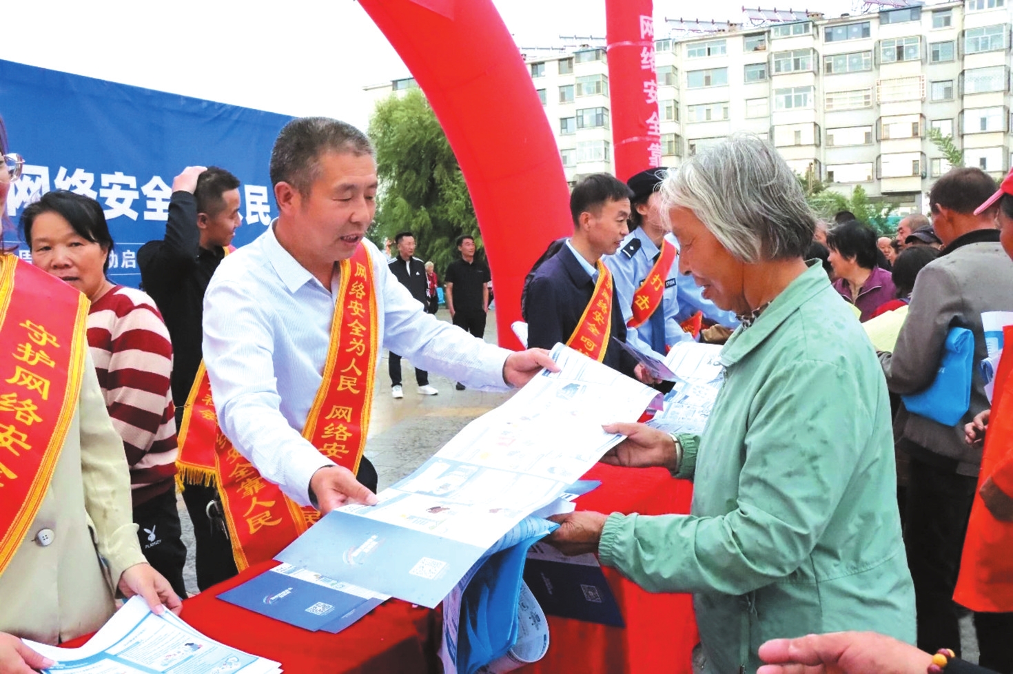圖為工作人員正在發(fā)放網(wǎng)絡(luò)安全宣傳資料。