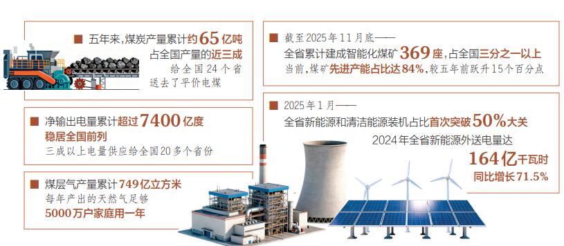 穩(wěn)產(chǎn)保供有力有效?!笆奈濉逼陂g,全省新增產(chǎn)能1.5億噸/年,日均產(chǎn)量穩(wěn)定在350萬噸以上,累計生產(chǎn)原煤約65億噸,占全國總產(chǎn)量的近三成;以長協(xié)價為24個省份保供電煤20億噸以上,有力保障了國家經(jīng)濟社會發(fā)展用能需要。